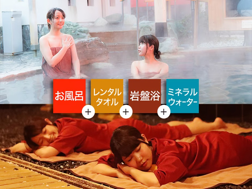 ・入浴料、岩盤浴、レンタルタオルセット、ミネラルウォーターが付いたお得なセットプラン!