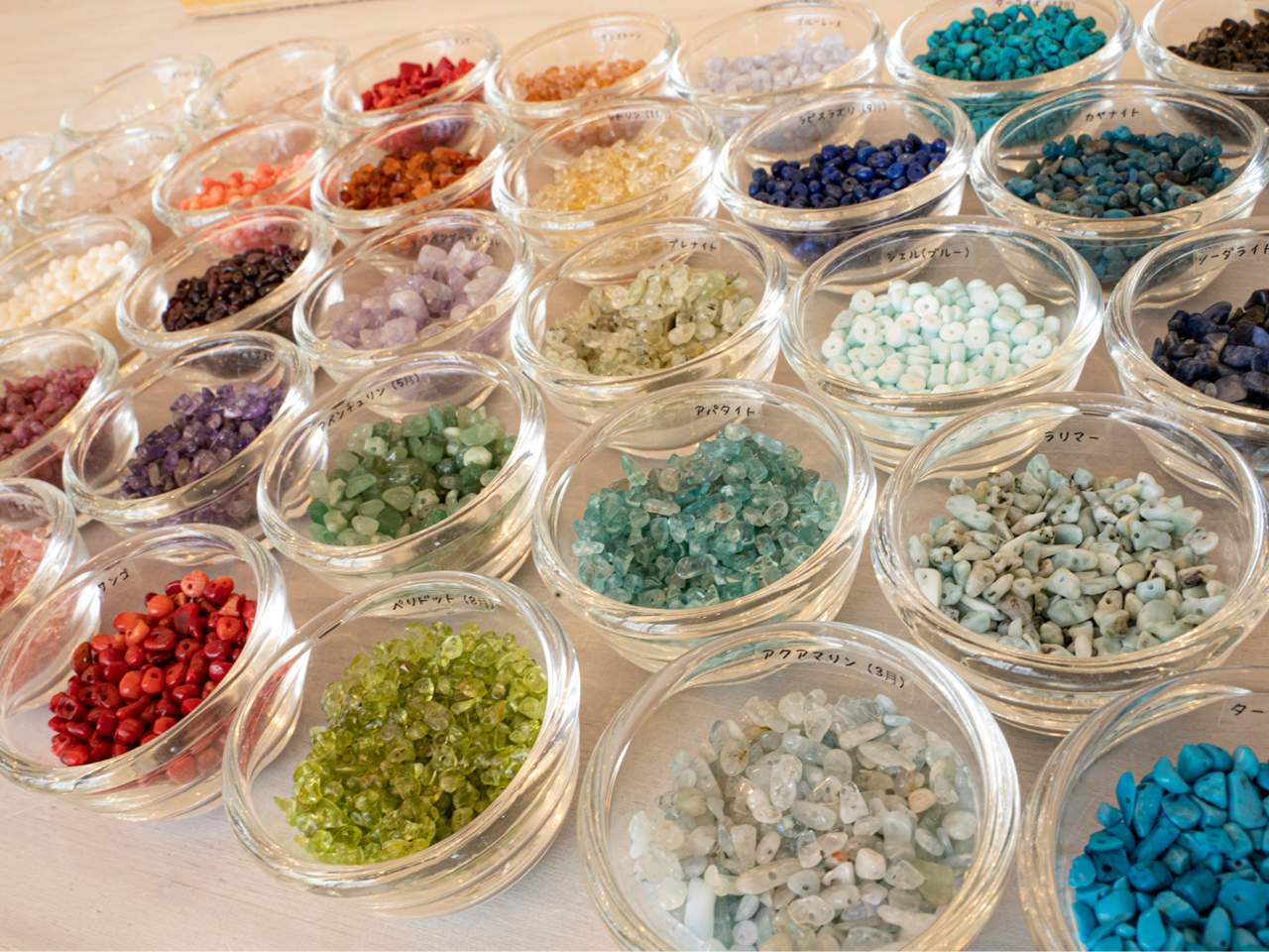 | 料金に含まれるもの | 体験料、天然さざれ石、テグス(ブレスレット1個分) ※別途有料パーツもご用意しております。 | 1予約あたりの予約可能人数 | 2人〜12人 |