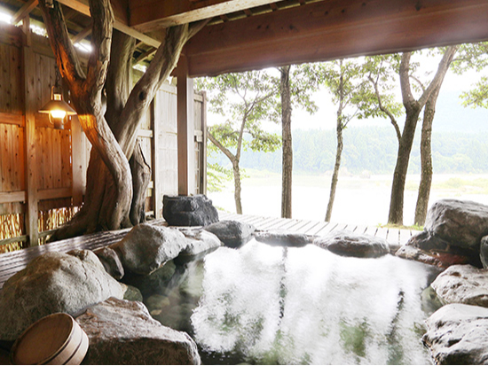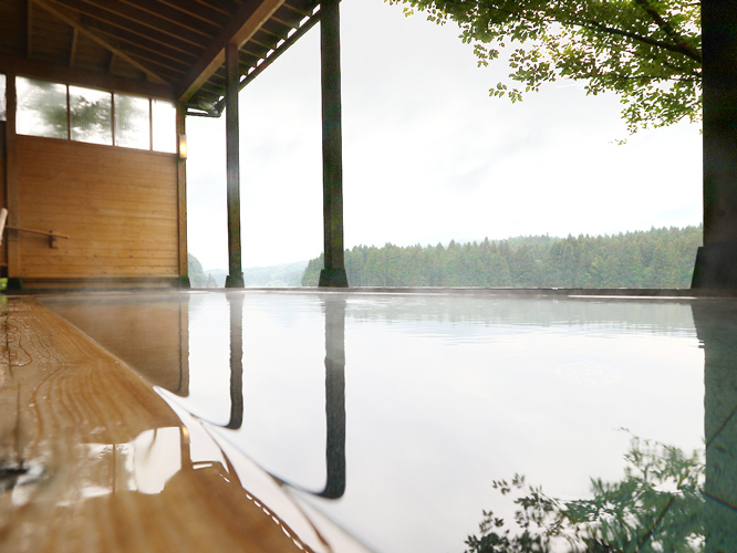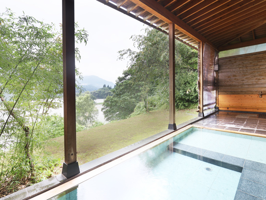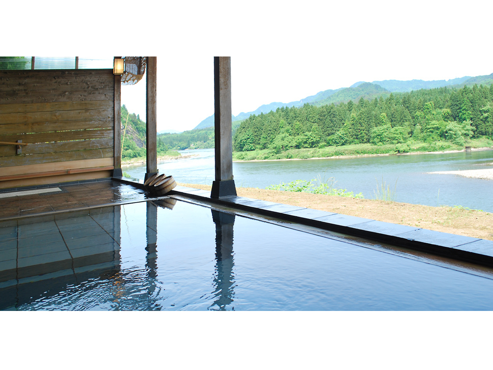 川のせせらぎ、鳥の鳴き声、虫の音を聞きながらゆったりとお湯を楽しんでいただけるよう、温泉を床面から静かに湧き出すようにしております。ぬるめのお湯にしていますので、四季折々の美しい景色と自然の癒やしの音色を楽しみながら、ゆっくりと温泉をご堪能ください。