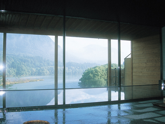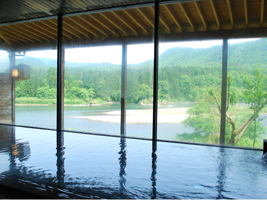 大浴場からの阿賀野川の眺望、全面ガラスのフレームに広がる大パノラマ