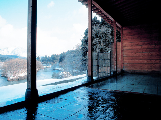 露天風呂からの阿賀野川の眺望、どこまでも広がる美しい山々も魅力