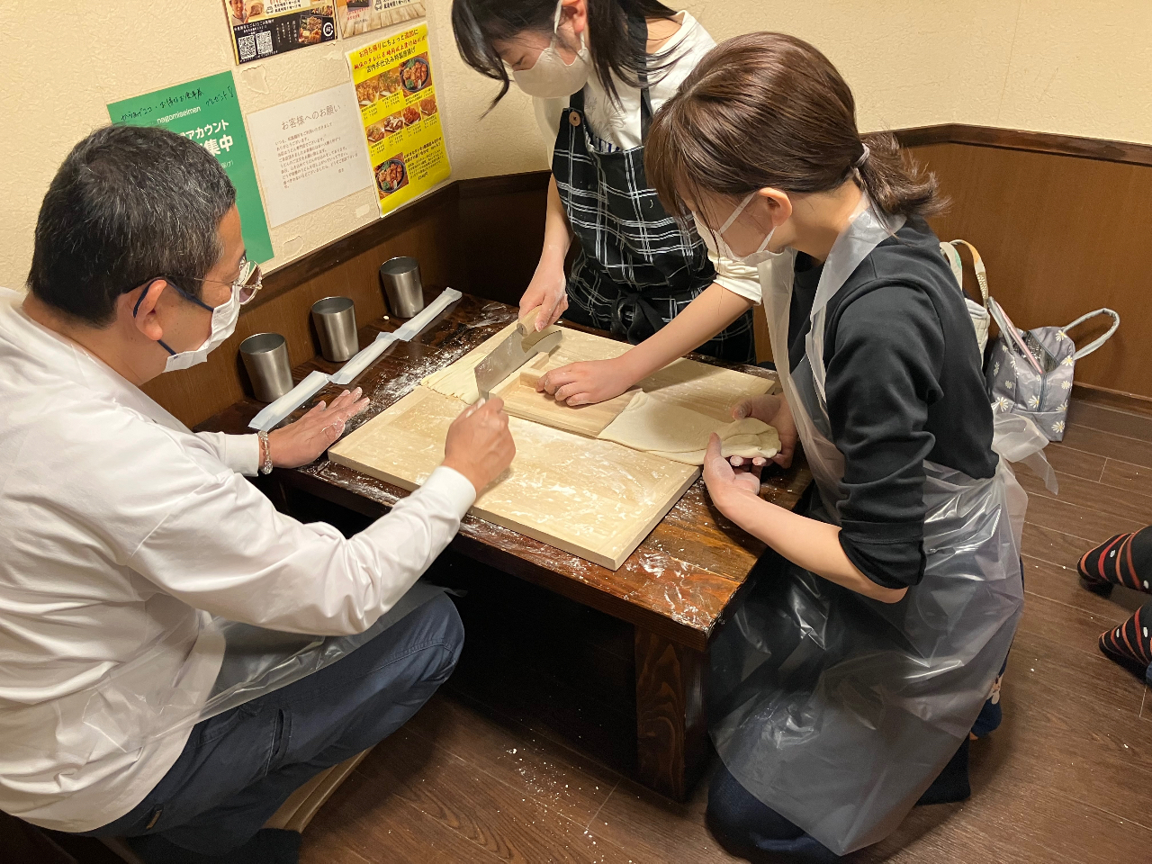 体験は受付後、職人のデモンストレーションからスタート。小麦粉の計量から始まり、生地を手でこねて踏み込み、滑らかに伸ばします。次に専用の包丁で切る工程では、職人が丁寧にサポートしてくれるので安心です。