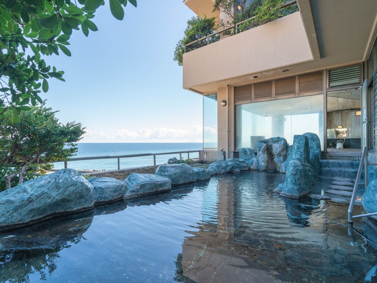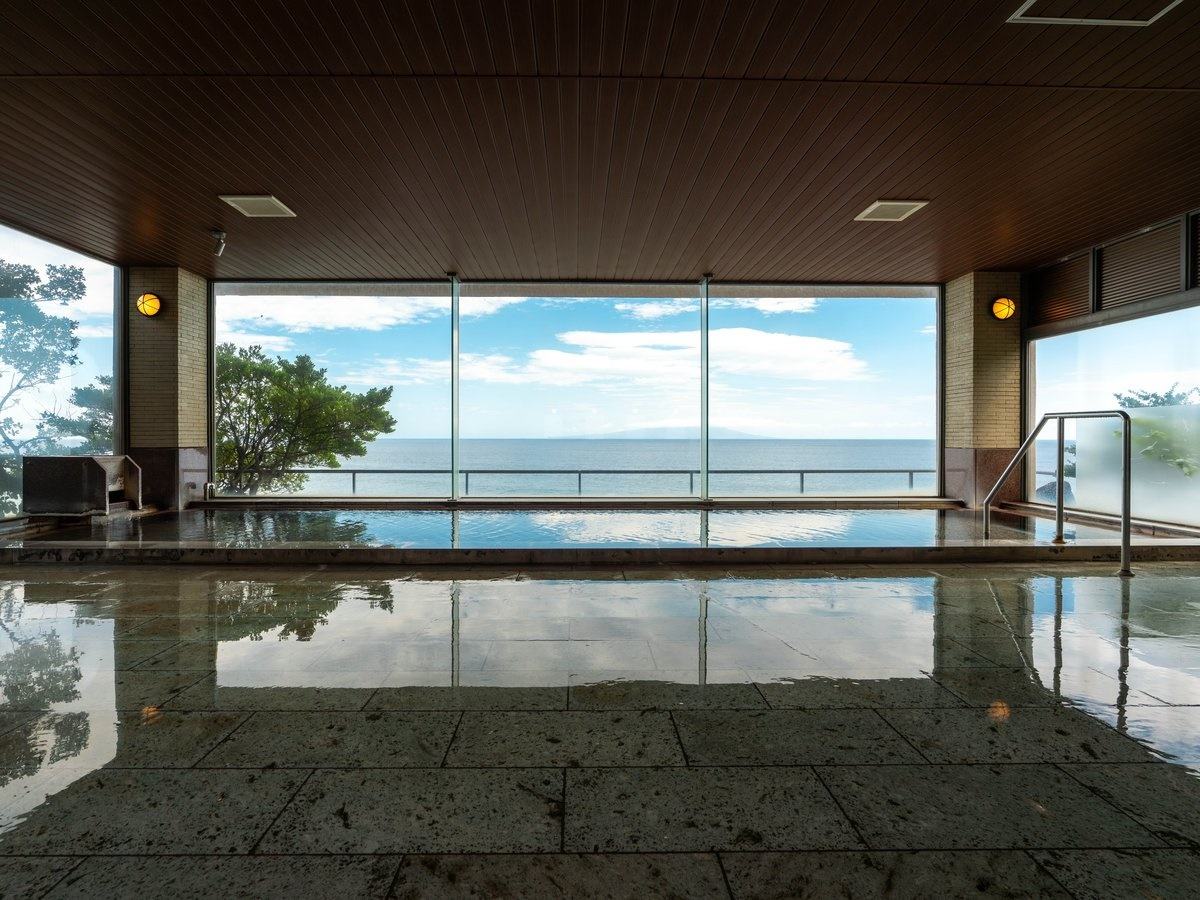 大浴場、露天風呂は、男女共に晴れた日には伊豆七島が見渡せ、豊富な湯の中で手足をのばせば、空と海につつまれる心地がします。