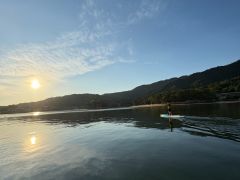 観光客のいない早朝の海へ。静けさに包まれながら、大鳥居を独り占めできる贅沢なSUP体験です。非日常の時間を味わえます。サップ・SUP(スタンドアップパドル)