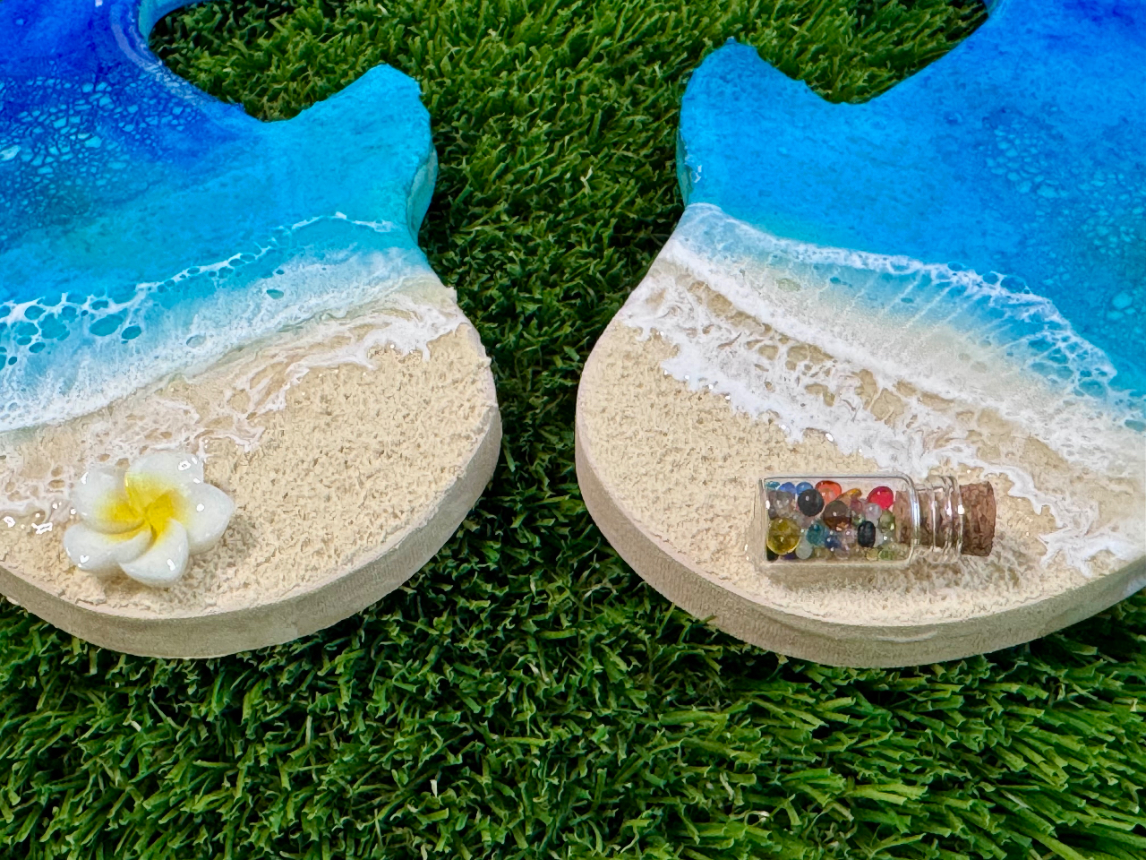 ペアのジンベイザメも可愛いと思います。シーサーの様に右が男の子で波打ち際には打ち上げられた小瓶に琉球ガラスを詰めました。左が女の子でプルメリアを飾りました。