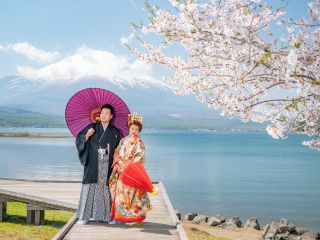 河口湖で富士山と湖を背景にフォトウェディングを。絶景です。ハネムーンにピッタリ。