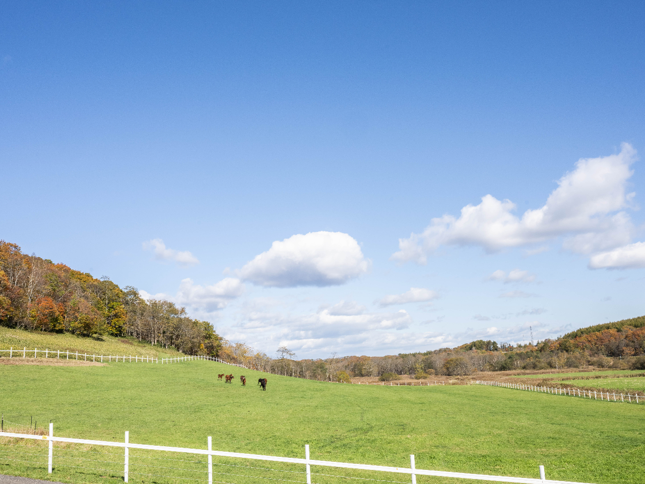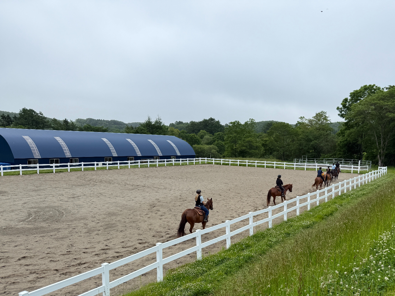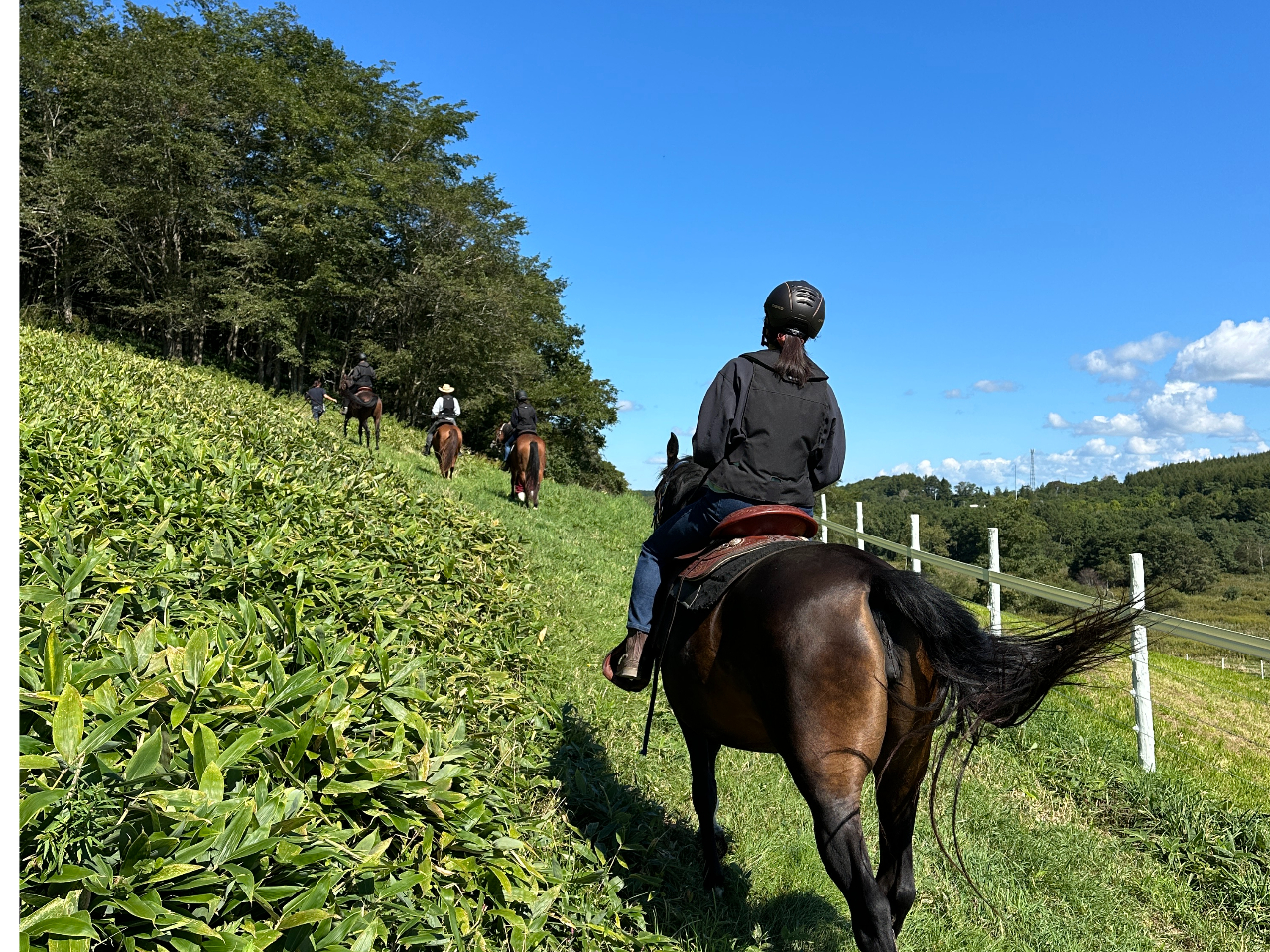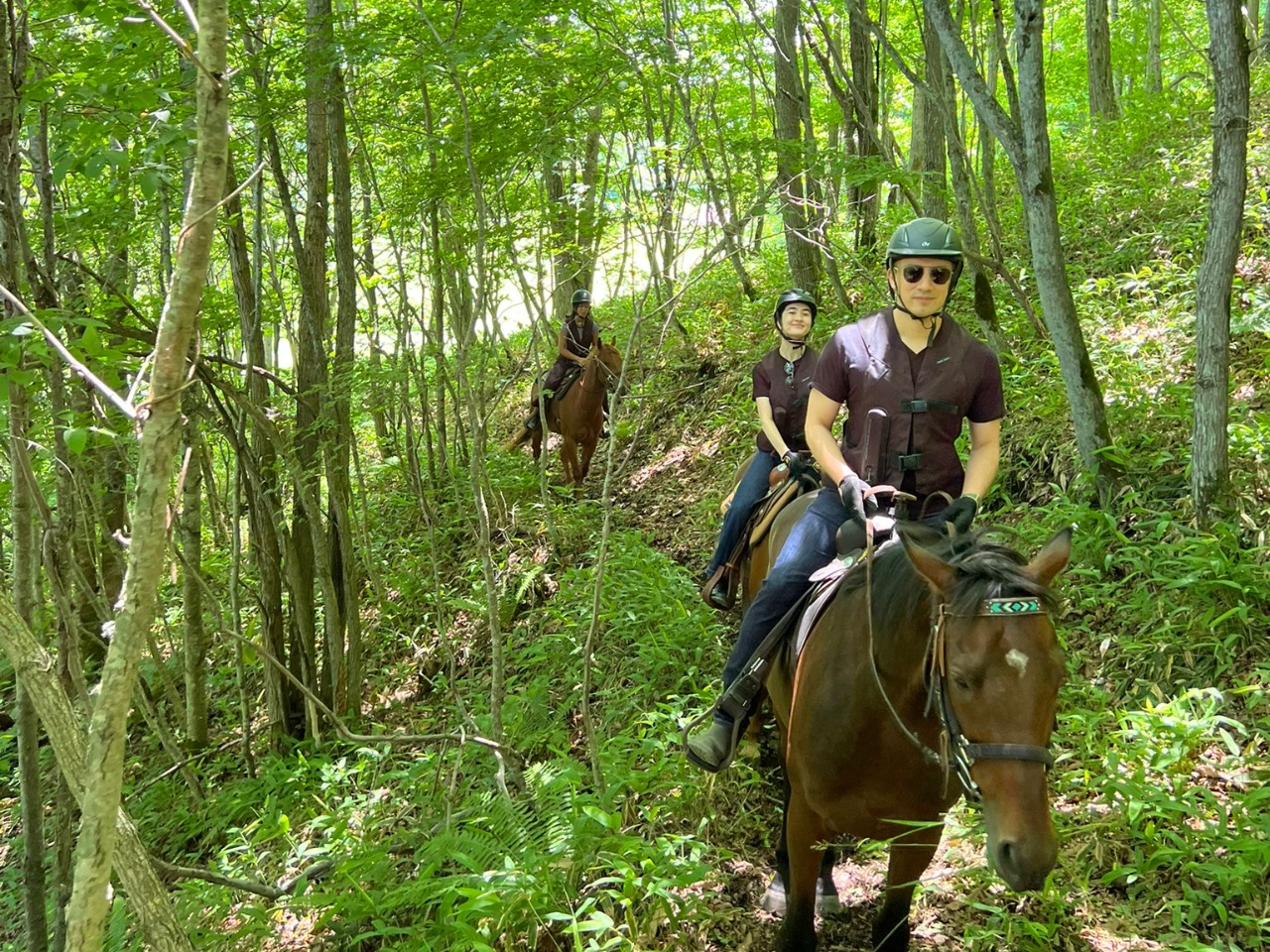 アップダウンのある林道と、自然の起伏を活かした牧草地を進み、高台トレーラーハウスでのお茶休憩も人気の、イチオシコースです。