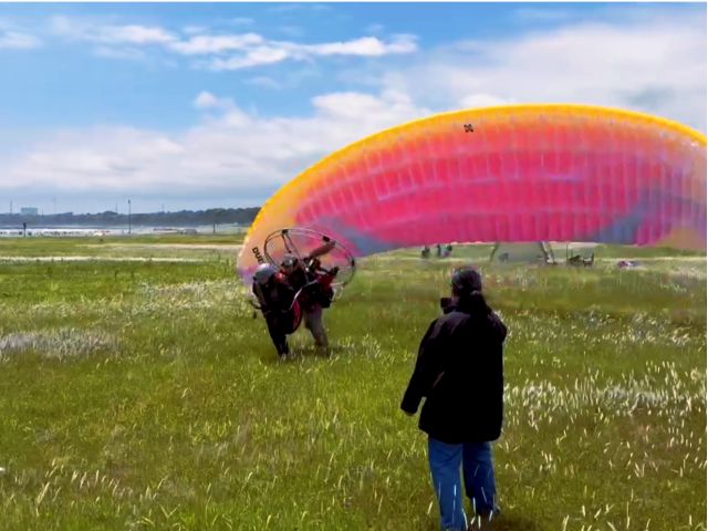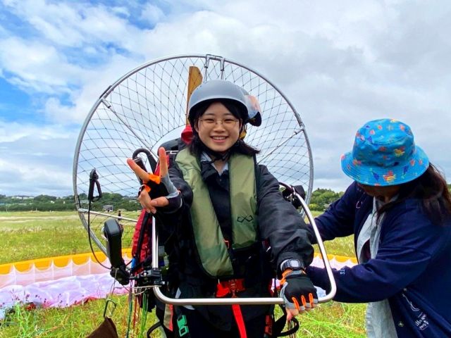 2人乗りモーターパラグライダーでの10分前後の体験フライトです。操作はJHFの上級タンデムライセンスを持ったプロのパイロットが行います。