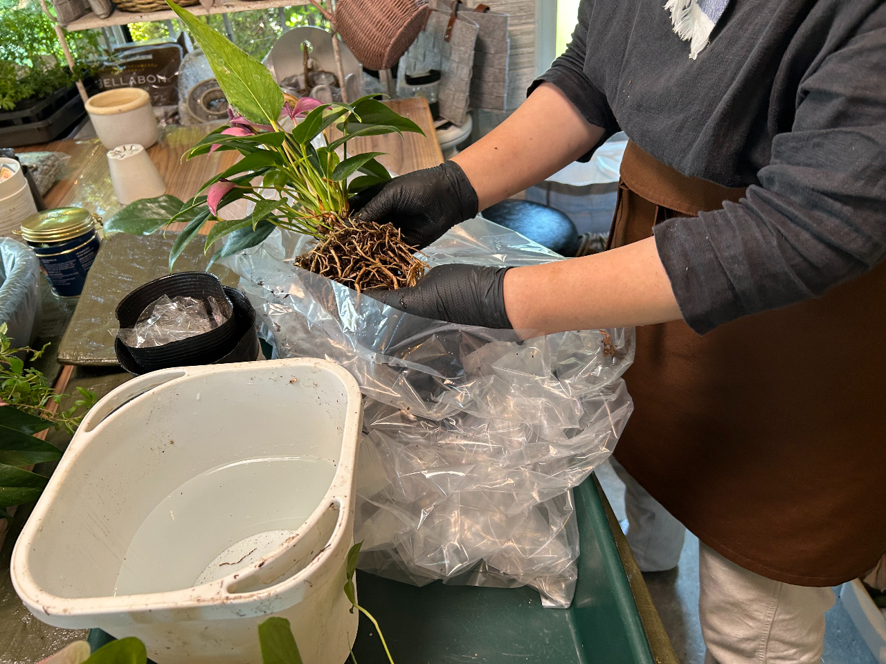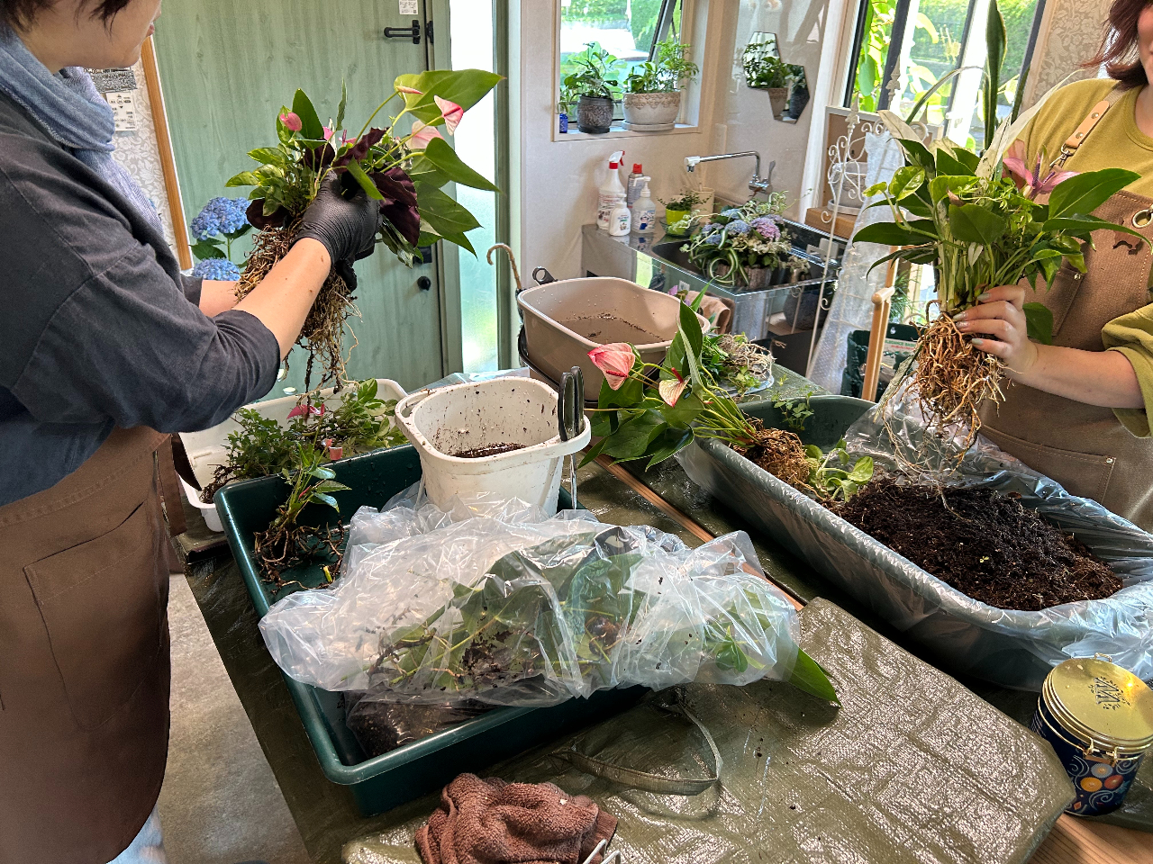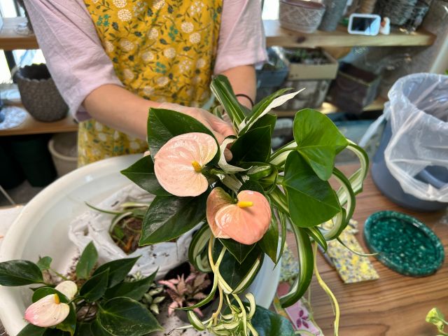 切り花ではなく根付きの植物を組み合わせ、ナチュラルで華やかな一体感を生み出します♪