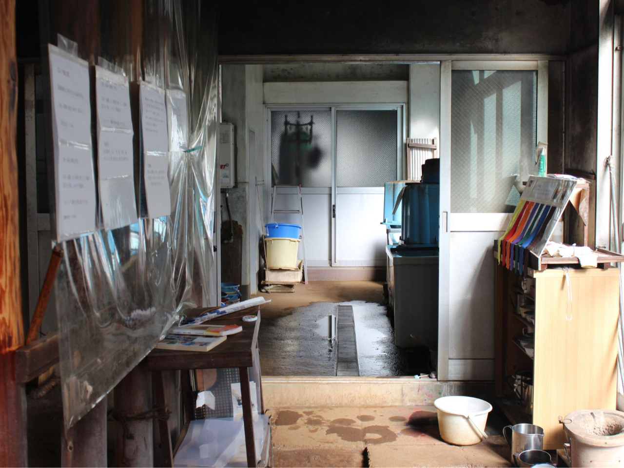 新宿とは思えない、どこか懐かしさを感じる広々とした工房には、昔ながらの土間に代々使い継がれてきた道具が並びます。染めに適した環境が整うこの空間で、あなただけのストールを染めてみませんか?