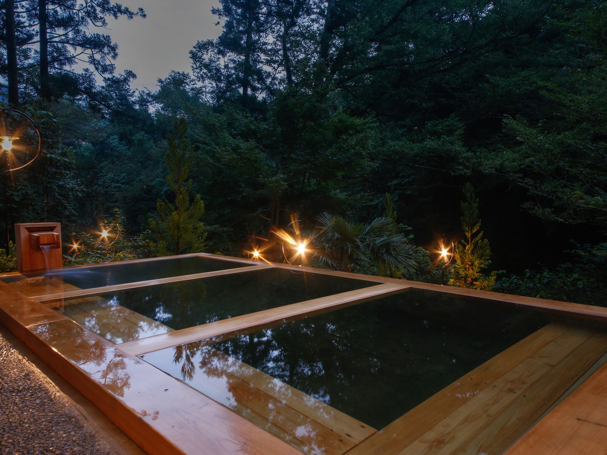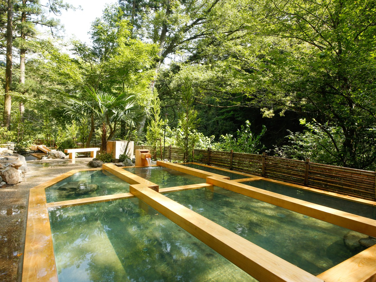 1つめのお湯は、専用の湯浴み着を着用していただき、男女の区別なく一緒に入れる日帰り野天風呂温泉「湯畑」、木立の中川音を楽しみながら湯音の異なる5つの湯舟が楽しめます♪