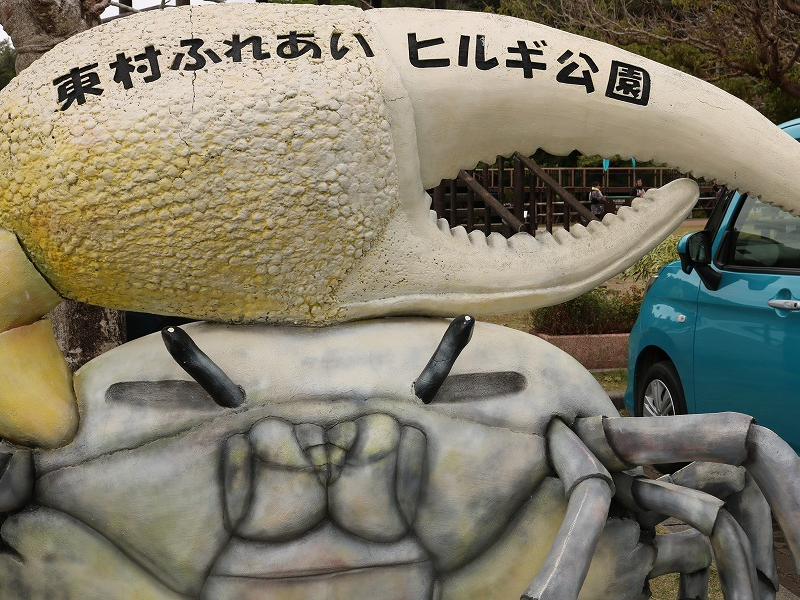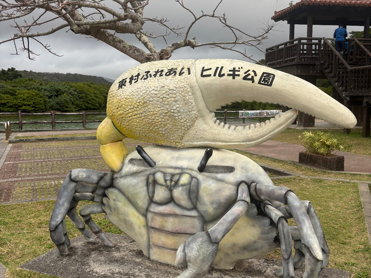 片方のハサミが大きいのがオスの特徴。集合場所の公園にもこの像があります。