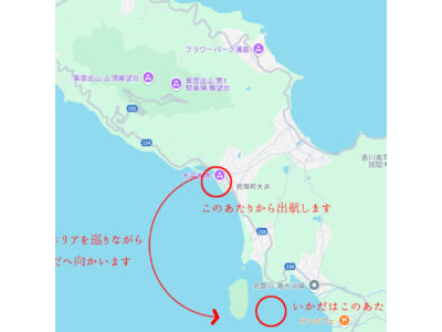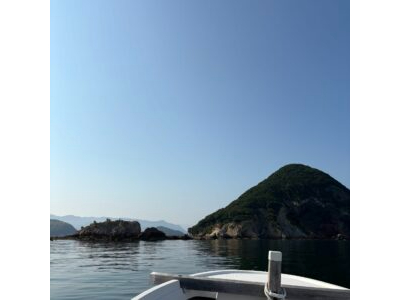 港から約10分間、船で丸山島の美しい岩肌を眺めながらイカダへ向かいます。