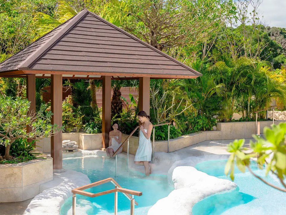 圧倒的な濃緑と広々とした青空。その絶景を映すインフィニティ風呂へ、そっと身を沈める。壮大な南国の空の下、世界自然遺産登録の森林地帯と連なる「やんばる」の山々と自分自身が溶け合うような贅沢。南国リゾートらしい洗練された屋外空間には、石灰岩風呂やサウナ。屋内には、洞窟風呂や美肌効果のある天然温泉など、さまざまな癒しのひとときを堪能できます。