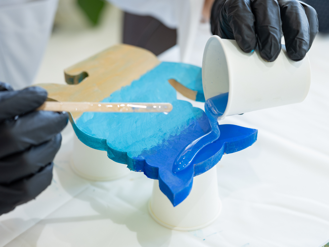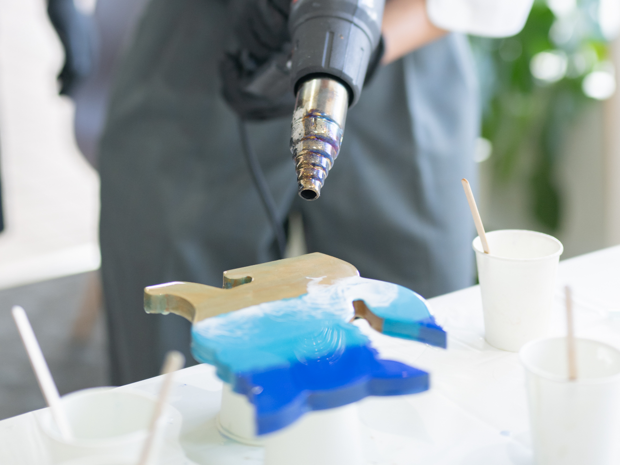 ここが波レジンアートの醍醐味!風の力で海を描く。白い泡や青の濃淡が生まれて、世界に一つだけの波が完成していきます