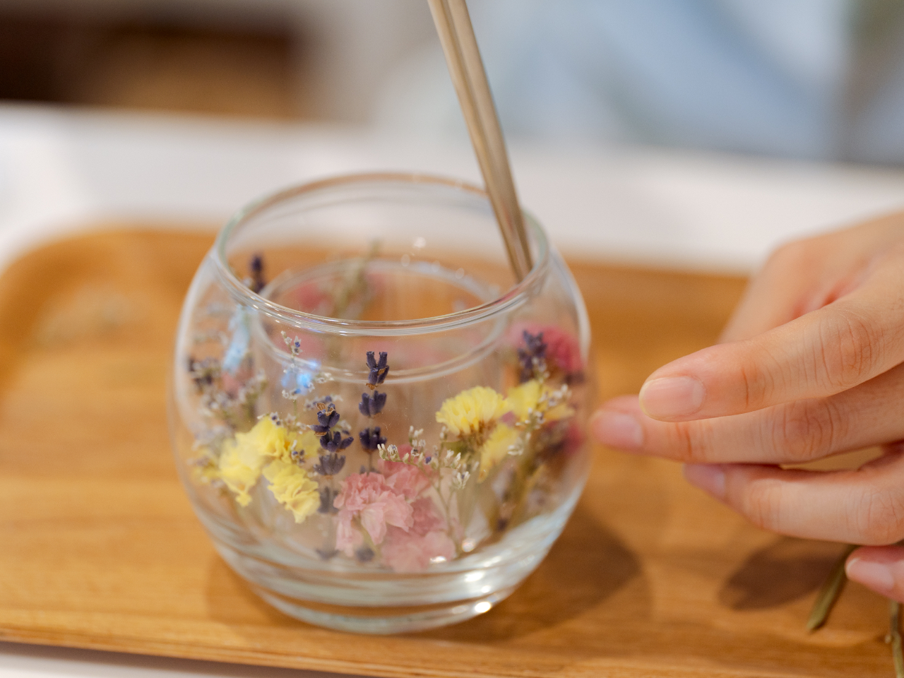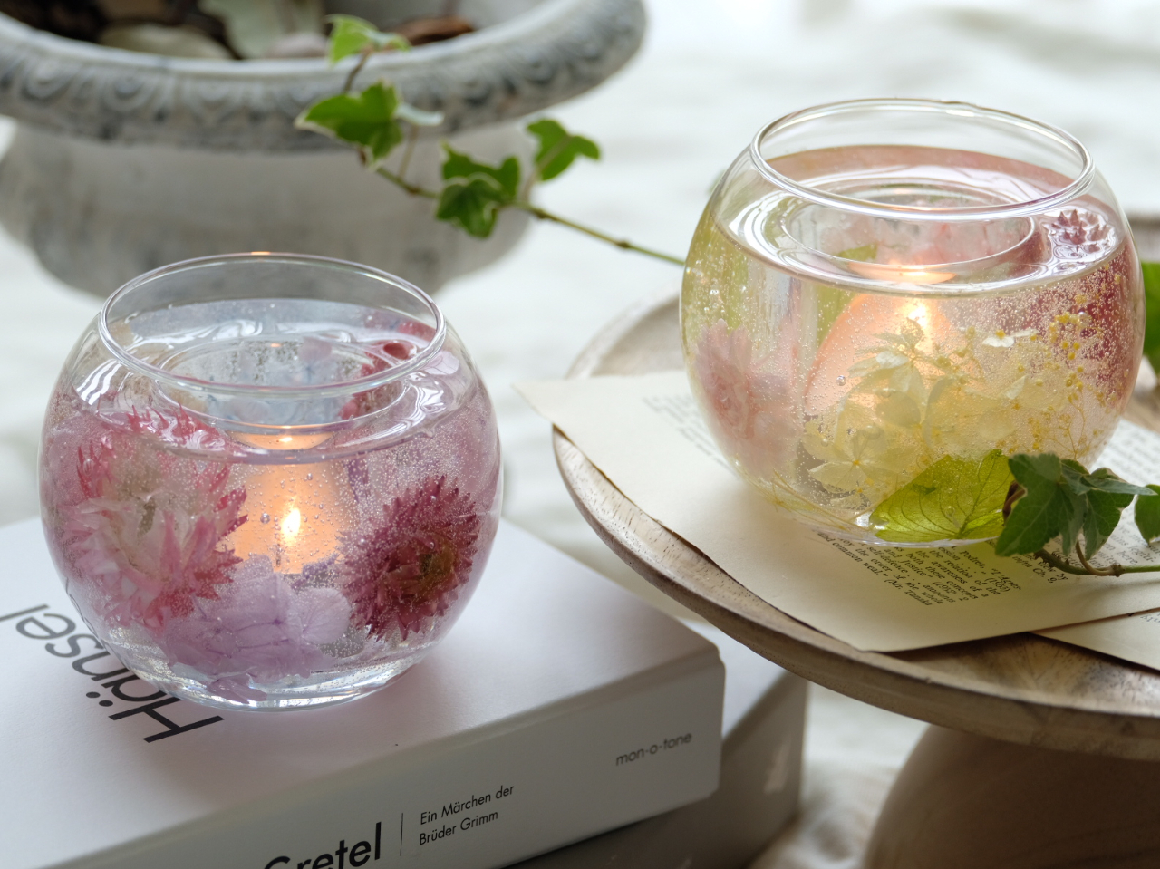 2つのグラスの間にお好みのお花をデザインし、透明ジェルワックスで閉じ込めて作るランタンです。