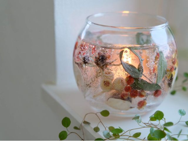 キラキラとした透明感が美しいジェルランタンは中に灯りを灯すとその優しい灯りにうっとりします。