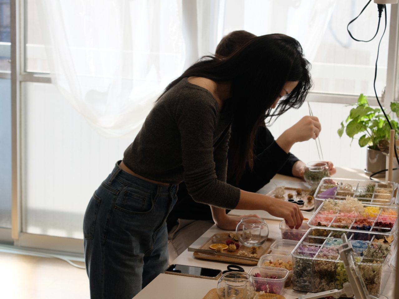 キャンドルの使い方やお花の選び方などを説明したあとに制作します。