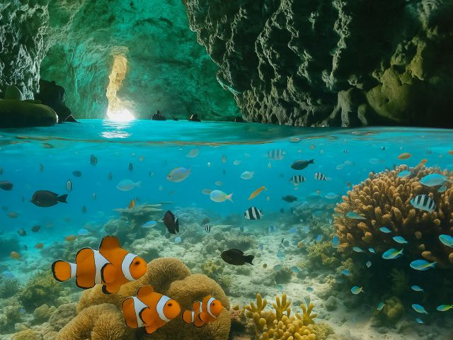 沖縄の中で一度は行ってみたい人気のスポット「恩納村・青の洞窟」を専属ガイドがご案内するプランです。洞窟付近までボートで行けるので、列に並んだり器材を装着しての歩き疲れもなく、楽しむことができます!