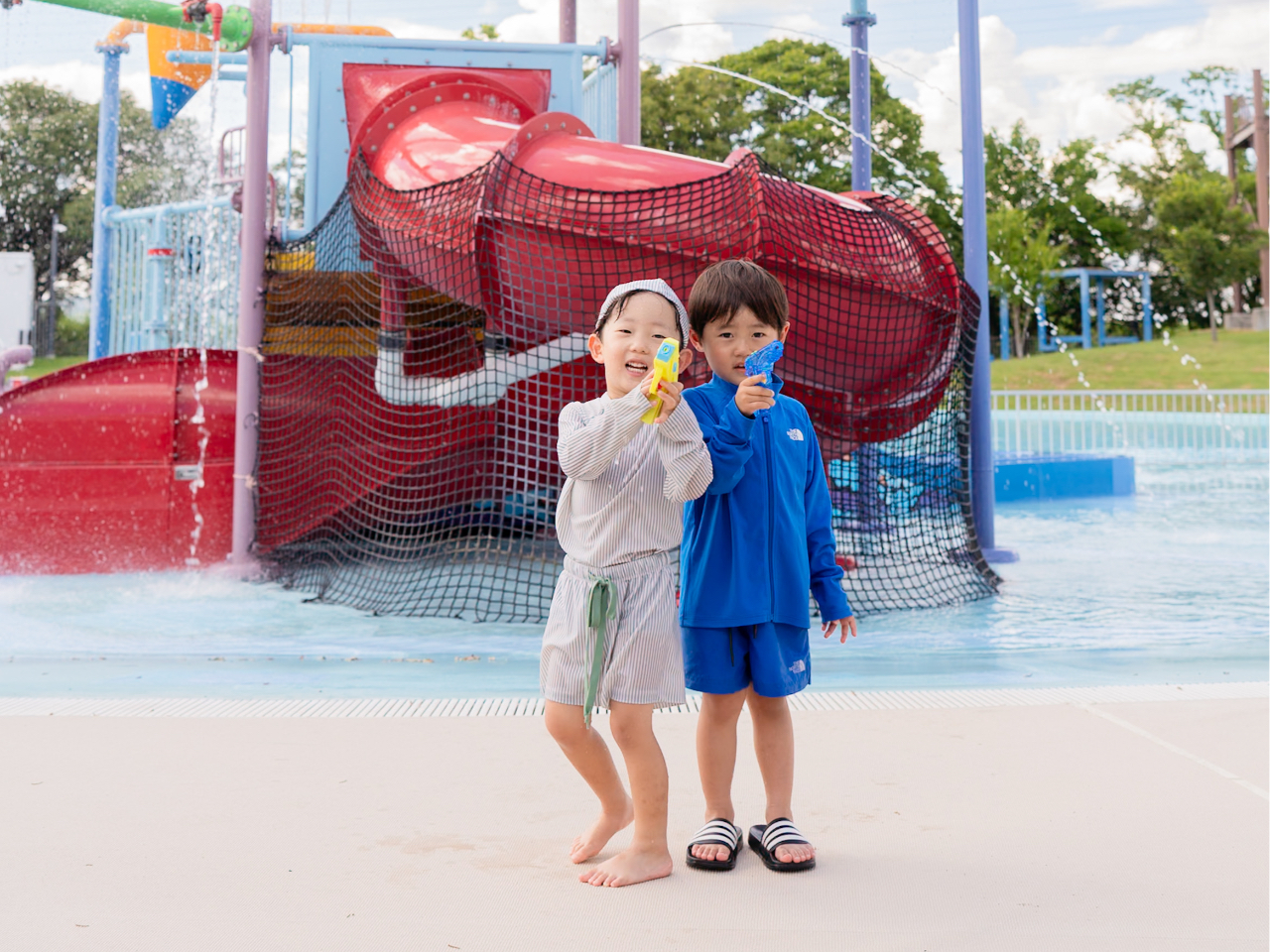 当日は入場ゲートにて予約画面をご提示ください。会場では、巨大遊具や水鉄砲遊びエリアが無料開放!さらに、時間別に「カラー水鉄砲でのTシャツ作り」や「水鉄砲射的レース」など多彩なコンテンツが楽しめます。初心者や泳げないお子様でも安心の幼児プールや遊具広場がメインのため、安心して遊べます。