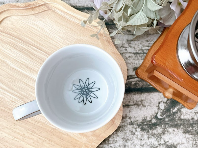 マグカップ・スクエアプレートのどちらかお好きな白磁を選んでいただき、当教室の転写紙を使ってポーセラーツを楽しんでいただきます♪