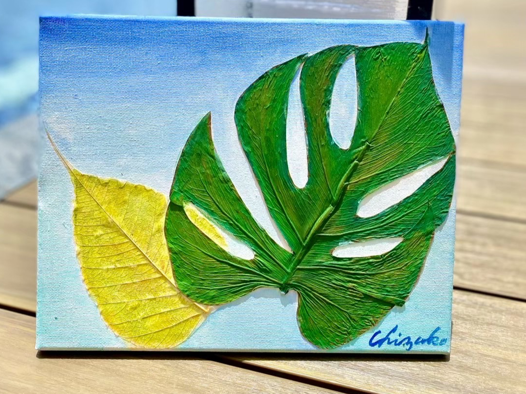 特殊加工を施された美しい大きな葉の「蓮の葉」、観葉植物で人気の「モンステラの葉」、ハート型でとても可愛い「インド菩提樹」などの葉を、特殊な方法で画材に貼り付け、