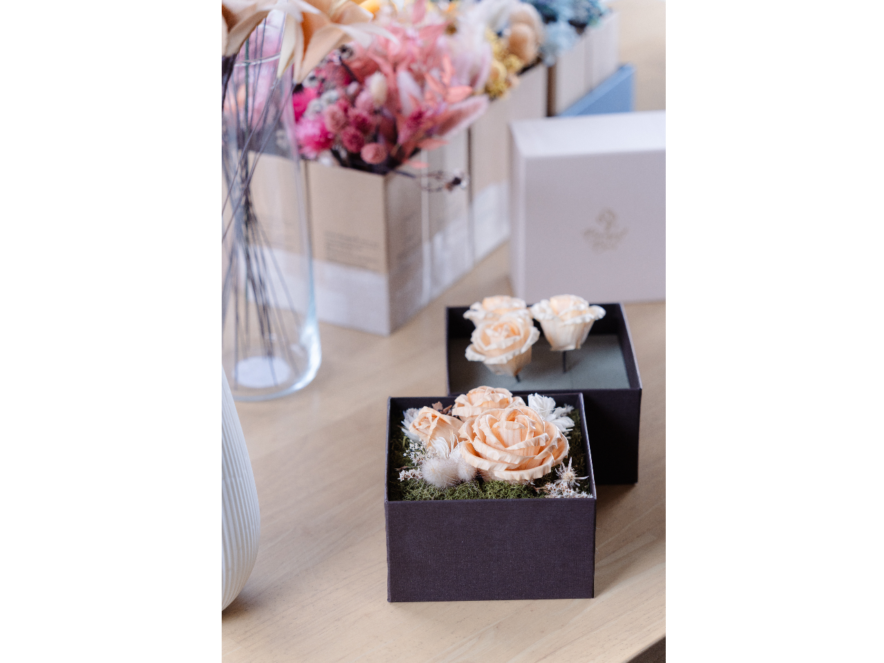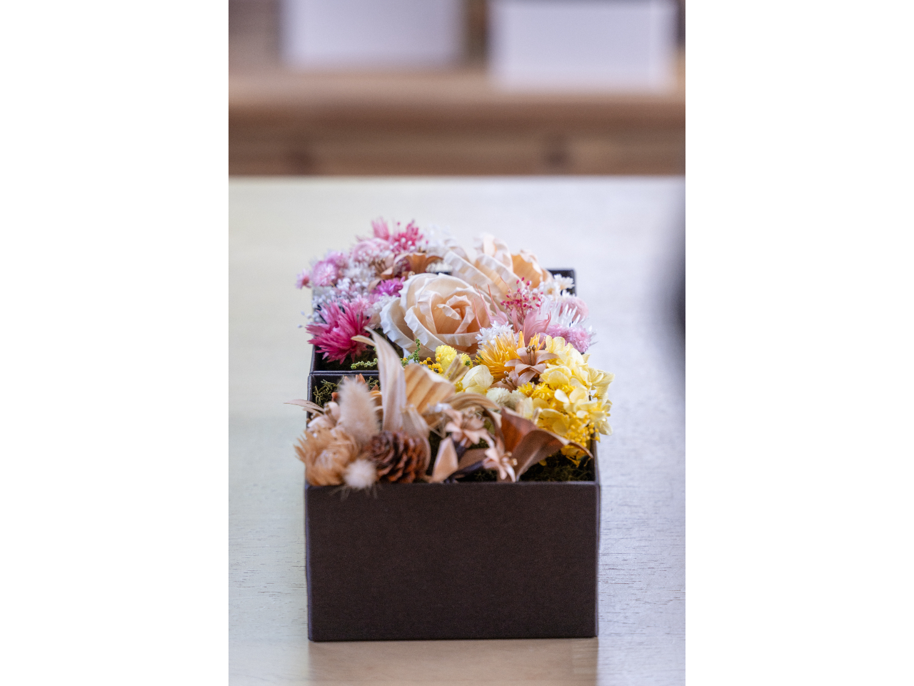 12cm角のボックスに平面的に配置する「ボックスアレンジメント」を制作。