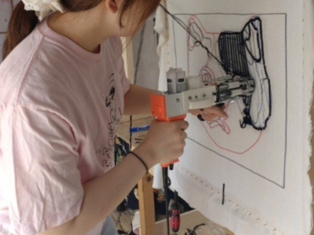 専用のタフティングガンを使って布に糸を打ち込み、フワフワとしたラグマットやウォールアートなどを作成する新しいクラフトです。