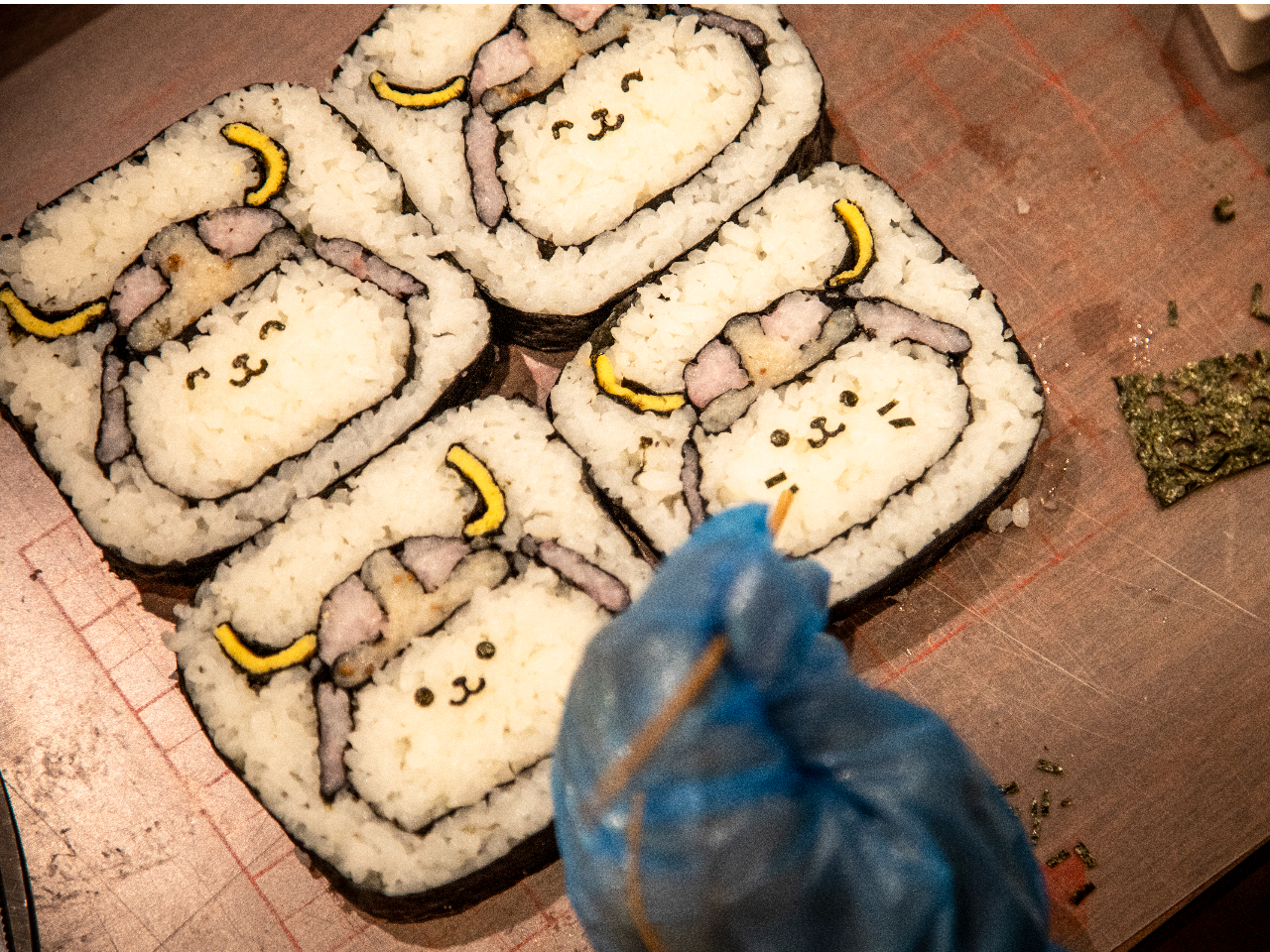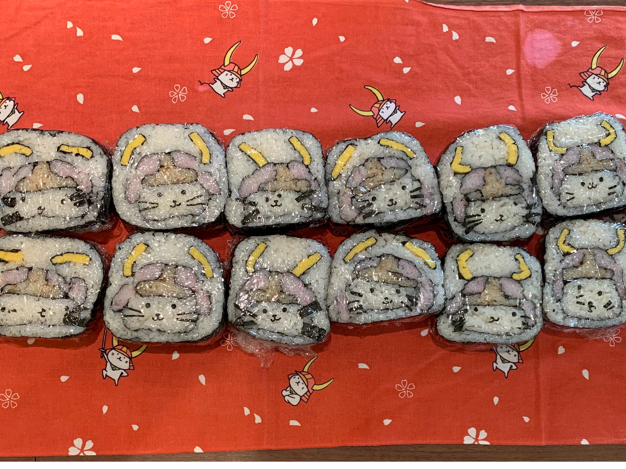 滋賀県彦根市のご当地キャラクター「ひこにゃん」をモチーフに、甲冑をかぶった姿を海苔や具材で再現します。