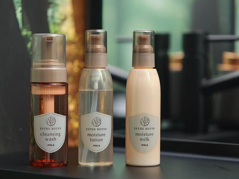 各部屋にはタオルやサウナハット、シャンプー、ボディソープ、化粧水、乳液などこだわりの各種アメニティをご用意。