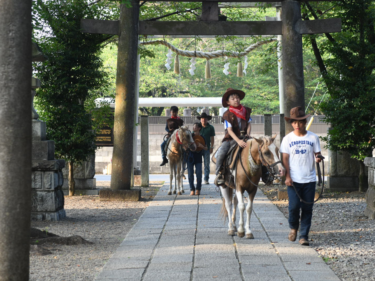 クラブから出発して、厳かな神社へ。自然や歴史を感じる風景の中で、馬と一緒に散策しながら撮影します。