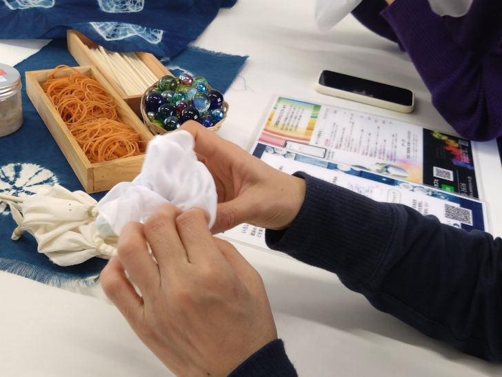 母、旦那さん、小学5年の娘、私の4人で体験しました。ハンカチを折ったり、ビー玉を包んだりして天然の染料につけて染めます。天然の染料で少し匂いが気になりますがどんな模様に仕上がるのか?ドキドキしながら染料に浸け、水で洗い、空気に晒したりを何度か繰り返しました。きちんと染まるかな?と不安でしたがとてもきれいな藍色に染まりました。家族それぞれ違う柄に仕上がってとても楽しかったです。駐車場もわかりやすく、トイレもあります。家族みんなで楽しい時間をすごしました。ありがとうございました!
