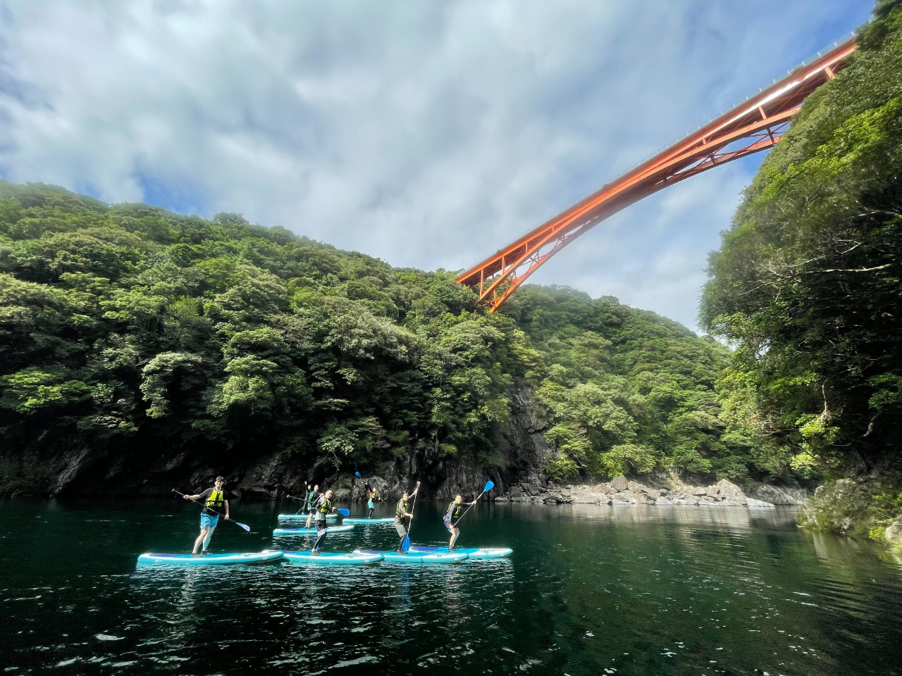 SUP(スタンドアップパドルボード)ツアーでは、この川の上で、ゆったりと、そして自由に水とふれあう時間を楽しめます。