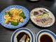 マンボウの味噌炒め。ふぐの身のような触感で美味しい。お刺身はグレ(メジナ)とアジ