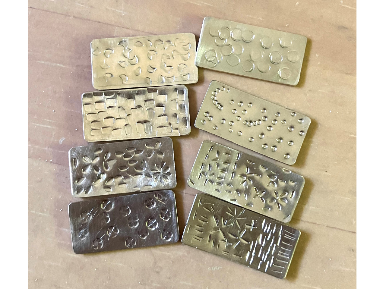 3.テキスタイルサンプルを参考にしつつ、真鍮板を使って刻印練習