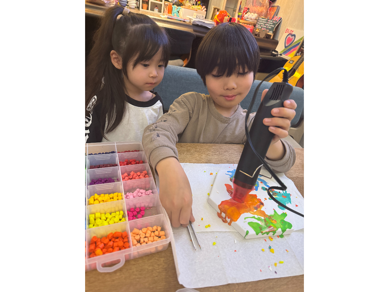クレヨンを削ったり、溶かしたり、風で飛ばしたりと多彩なアート技法に挑戦できます。