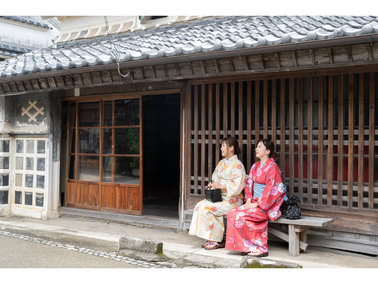 室戸市・吉良川の伝統的な町並みで、レンタル着物を着て街歩きし、散策後は吉良川の古民家を改装したお食事処「玄(kuro)」で土佐備長炭の炭料理を楽しめます。