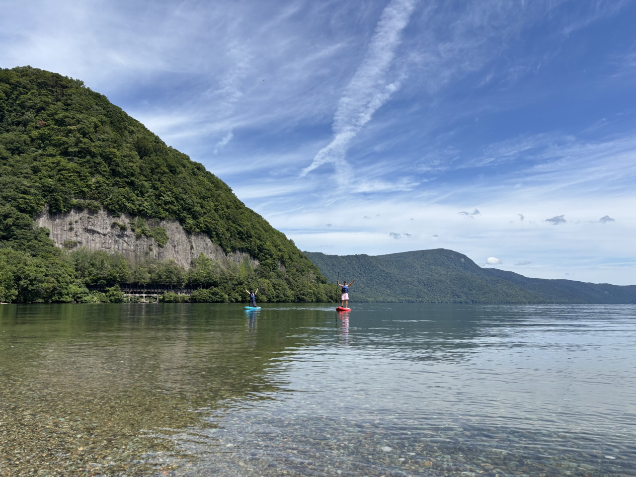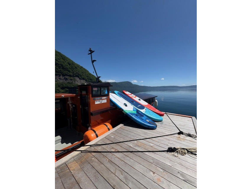 【Enjoyとわだこ】のSUPプランは、透明度の高い湖面をすべるように進む爽快感と、