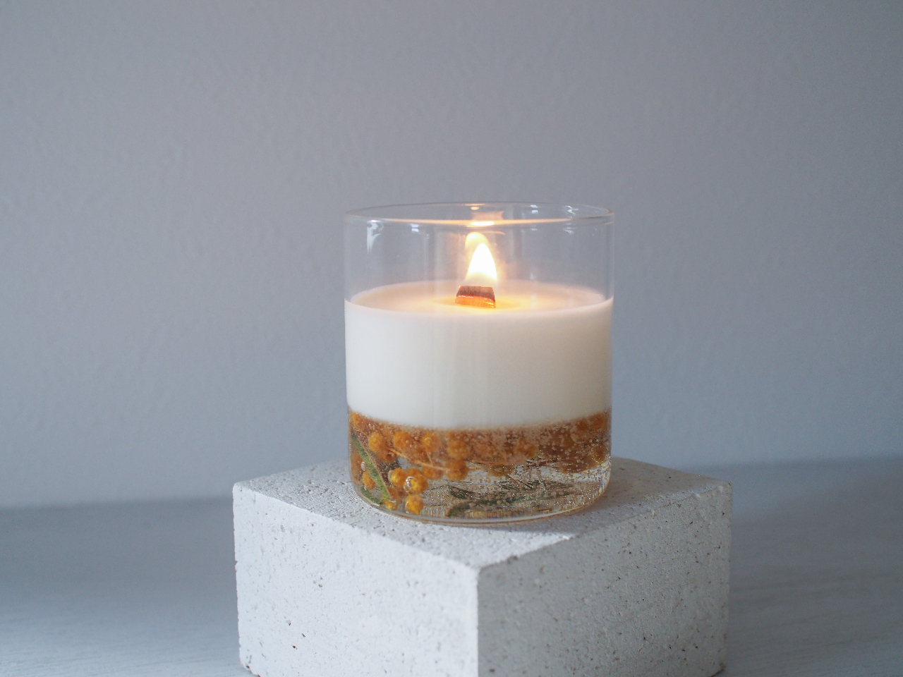 ・ガラス容器にお好きなお花を入れてジェルワックスを注ぎます。