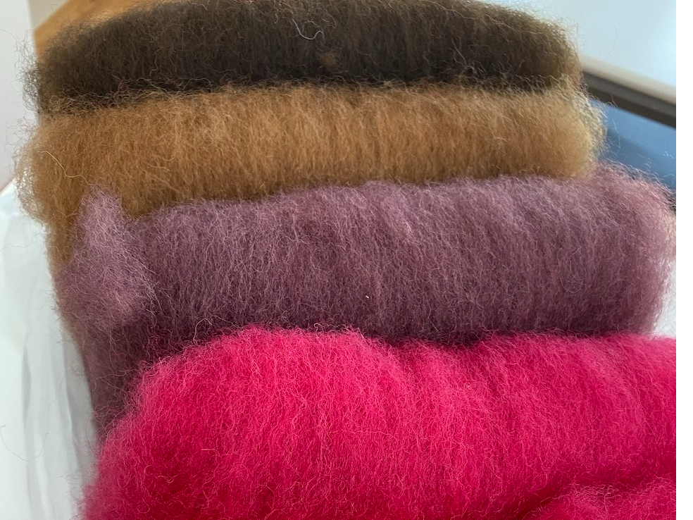 好きな色の羊毛を選んで、道具を使わずに膝でコロコロ糸紡ぎ体験! 羊の毛から糸ができる過程にワクワクします。