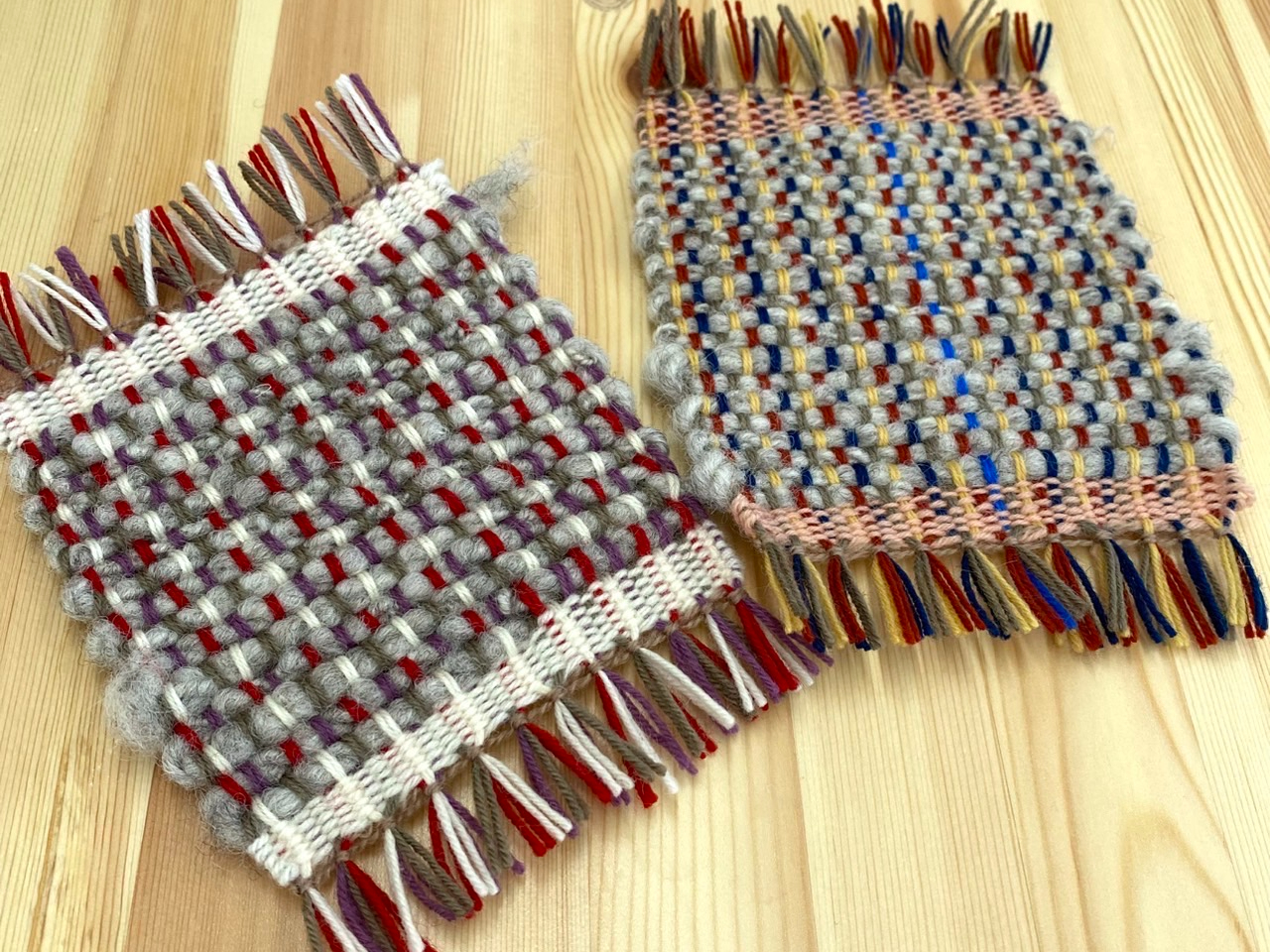 紡いだ糸も織り込んで、自分だけのコースターを作ってみましょう。