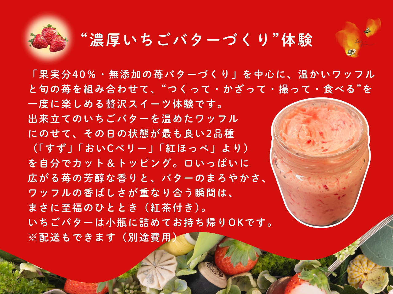 1ー3月限定!苺狩りじゃない、旬の完熟苺を“つくって味わう” 濃厚いちごバターづくり体験(持ち帰りOK)ワッフル&紅茶付き【静岡市・オクシズ】
