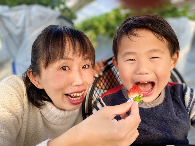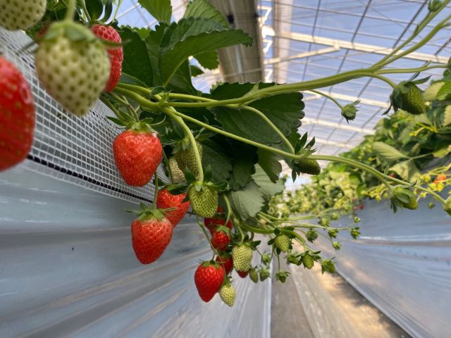 ハウス内は通路幅も広く車いすでもOK!高設栽培なのでスムーズに収穫♪