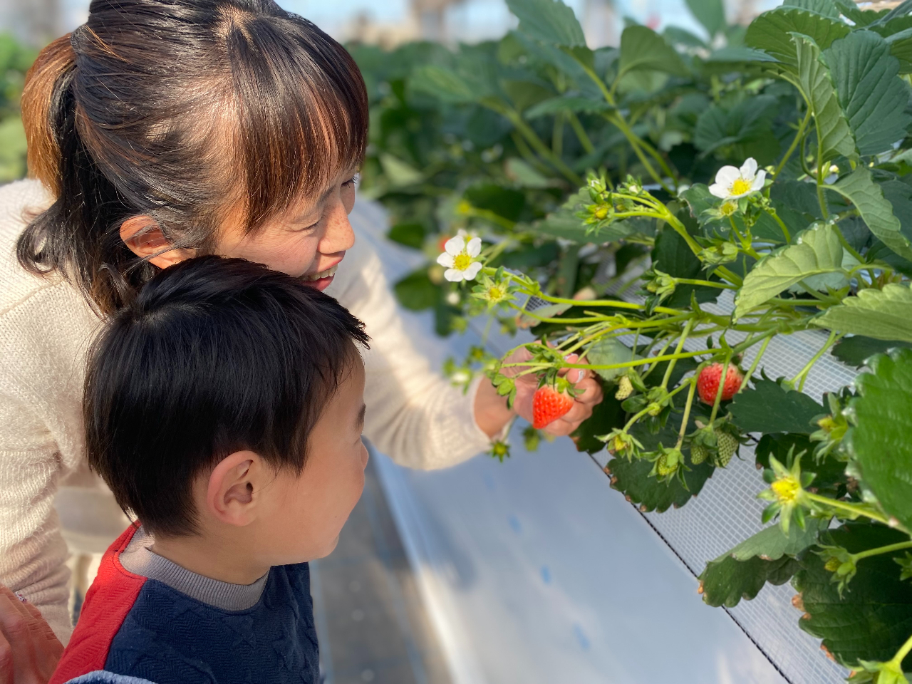 小さな子供も目線で収穫できる高設栽培がファミリーにも人気。