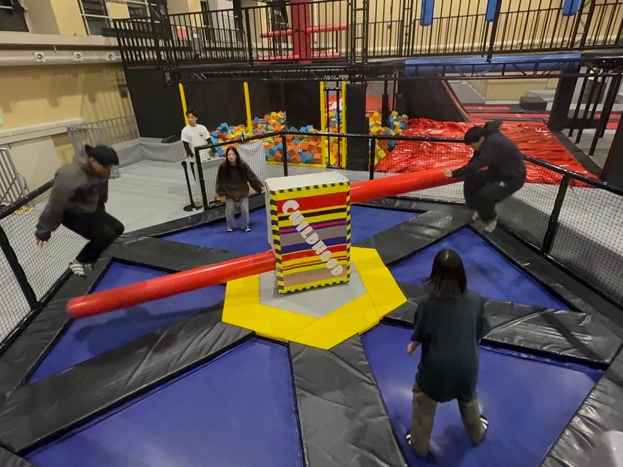 \wipeout/トランポリンを跳びながら回転する障害物をよけるアトラクション。タイミングを合わせてジャンプしたり、かがんだりスタミナも必要!!
