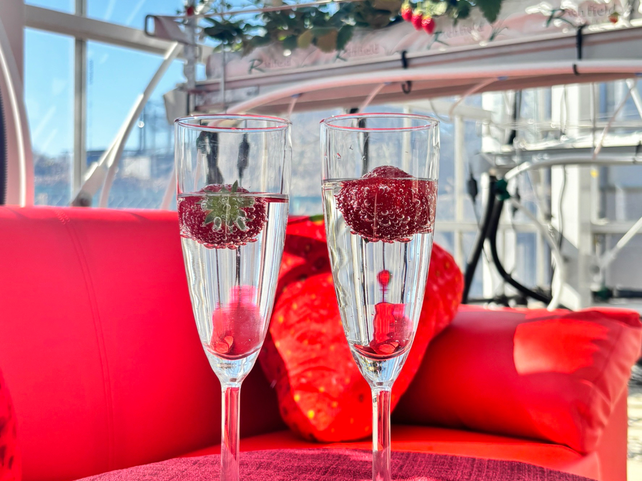 彼女がやりたいことリストの中にいちごがりが入っており、せっかくだったらゆっくり過ごせるいちごハウスを探しました。探していると、なんといちごハウスの中で、座ってゆっくりスパークリングワインが飲めるおしゃれハウスが。料金は、高かったのですが、本当にいちごハウスでゆっくり彼女と話ができて、貴重で豪華で豊かな時間でした。