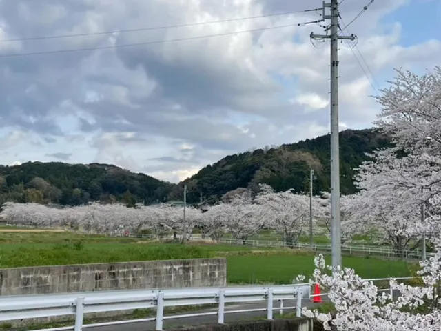農園名の由来でもあり、ハウスの前に市の天然記念物である樹齢1300年のしだれ桜、川沿いには桜並木が広がり、春にはお花見も楽しめます。