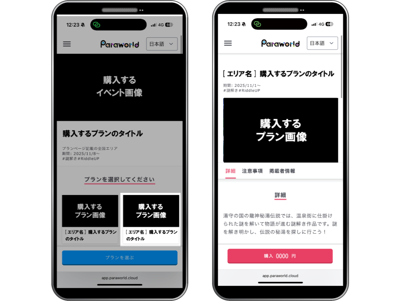 イベントページ内で、お客様が体験するエリアのプランを選択し、購入ボタンを選択します。ご購入後払い戻しは出来ません。お間違えのないようにご注意ください。