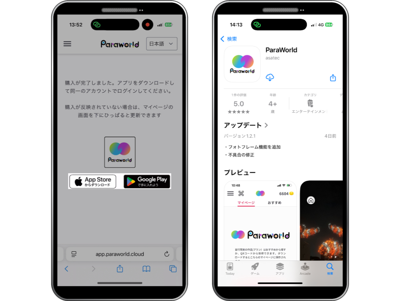 決済が終わると左のページに移動します。各端末のストアボタンを選択しParaworldのアプリをダウンロードしてください。