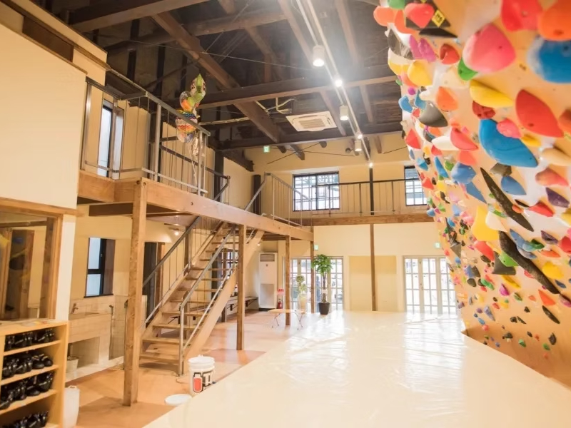 アーケード商店街の中に広がる、天井の高い開放的なクライミング空間。色とりどりのホールドが並ぶ壁は、見るだけでも楽しめる迫力があります。併設ショップではシューズやアパレルも取り扱っており、観光ついでの見学利用も歓迎。運動体験と街歩きの両方を楽しめるのが魅力です。